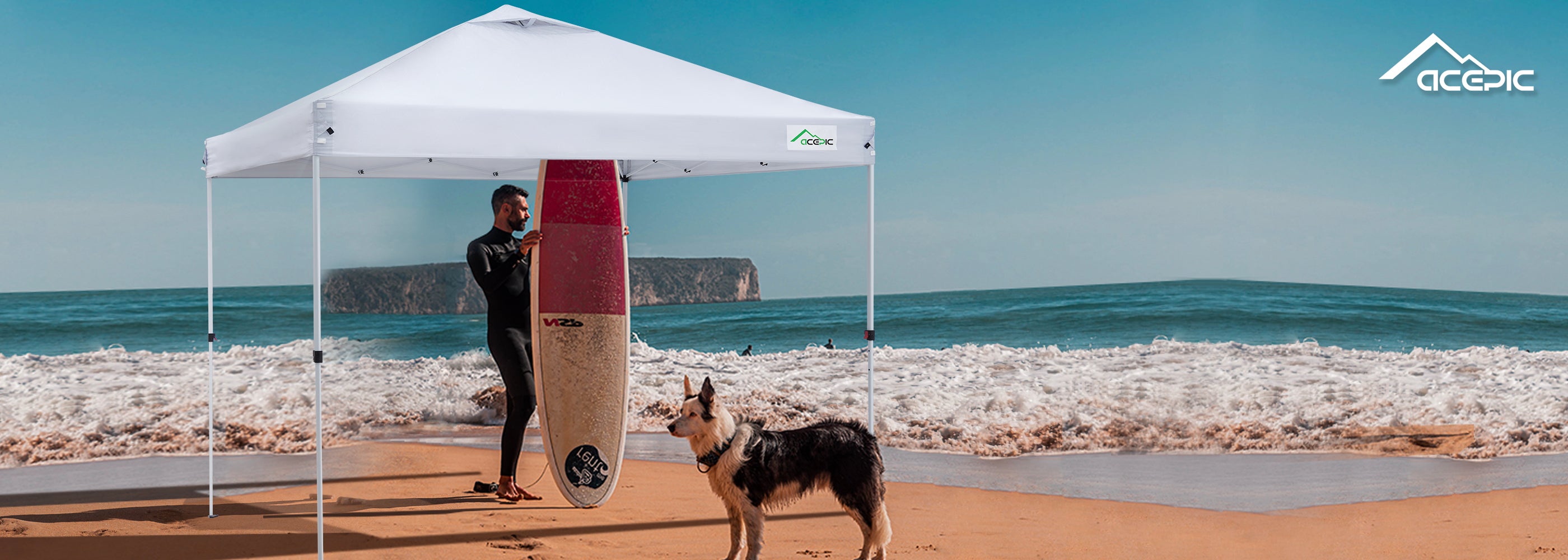 - Complete Package: 1 canopy frame, 1 canopy top, 4 ropes, 4 sand bags, 8 pegs and 1 wheel-bag.